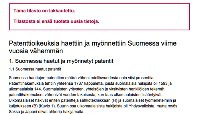 Tilastokeskus lakkasi jo vuonna 2013 julkaisemasta Suomen patenttitilastoja, mitä ilmeisemmin siksi, että hakemusten määrä oli laskenut ennätysmäisen alhaiseksi.